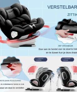 - Rotation à 360°: Permet de facilement installer et sortir votre enfant du siège, et de passer de la position dos route à la position face route.